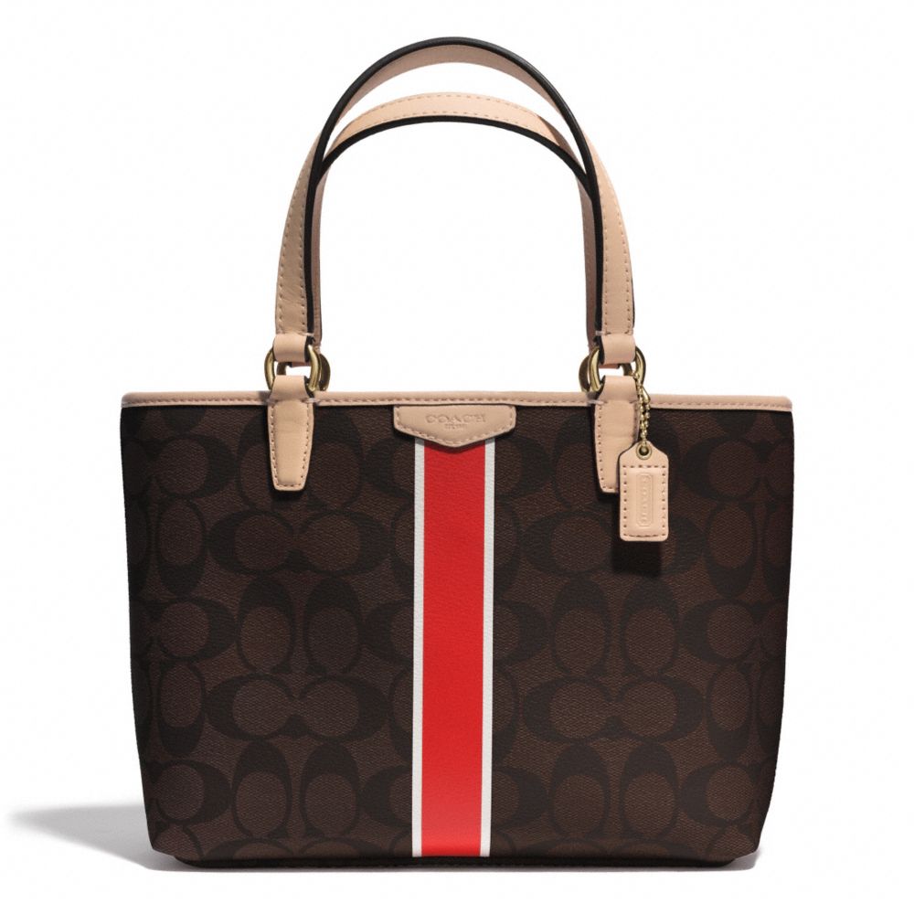 COACH F51267 - SIGNATURE STRIPE TOP HANDLE TOTE - BRASS/BROWN/VERMILLION (click the link before for more detail)